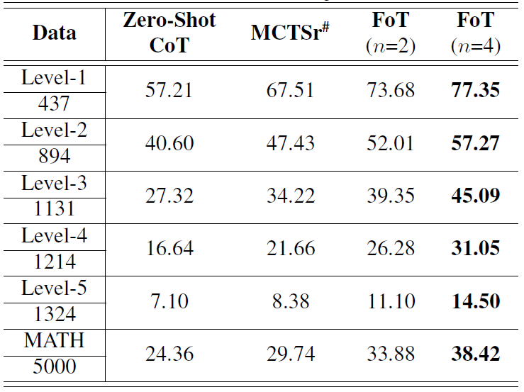 在 MATH 数据集上,FoT 算法在不同复杂度级别的问题上均展现出一致的性能提升。如表 2 所示,从最简单的 level1 到最具挑战性的 level5,FoT(n=4)的准确率比 MCTSr 提高了约 10%。这种一致的提升凸显了 FoT 方法在处理从简单到复杂问题的有效性。