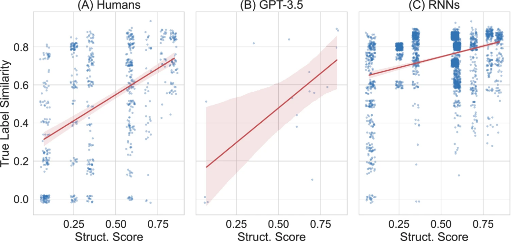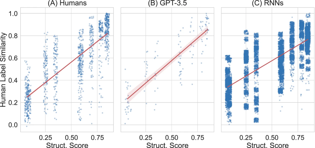 图3进一步证实,在学习结构更规范的语言时,GPT-3.5创造的表达方式与人类的思维更加接近。这就像两个学习同一门外语的人,如果这门语言的规则很清晰,他们更可能想出相似的表达方式。
