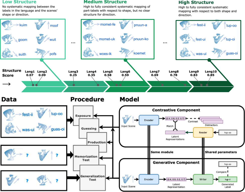 为了实现人类与机器的直接对比,图1遵循了此前一项语言学习研究的设置,共使用了10种人工语言。这些语言通过人类群体实验生成,结构从完全无规律的标签到高度系统化的标签不等(例如,同一形状向不同方向移动可以用完全不同的词描述,或使用共享部分的词描述,如“fest-ii”和“fest-ui”)。实验中,神经网络与人类接受相同的学习任务和反馈,并在记忆与泛化测试中进行对比评估。研究结果显示,高组合性的语言输入不仅使神经网络能够更有效地泛化和记忆,还使其表现出与人类更为相似的学习特征。这表明,语言的系统性对人工智能和人类语言学习都有重要意义,为进一步模拟语言结构的形成提供了新的研究方向。