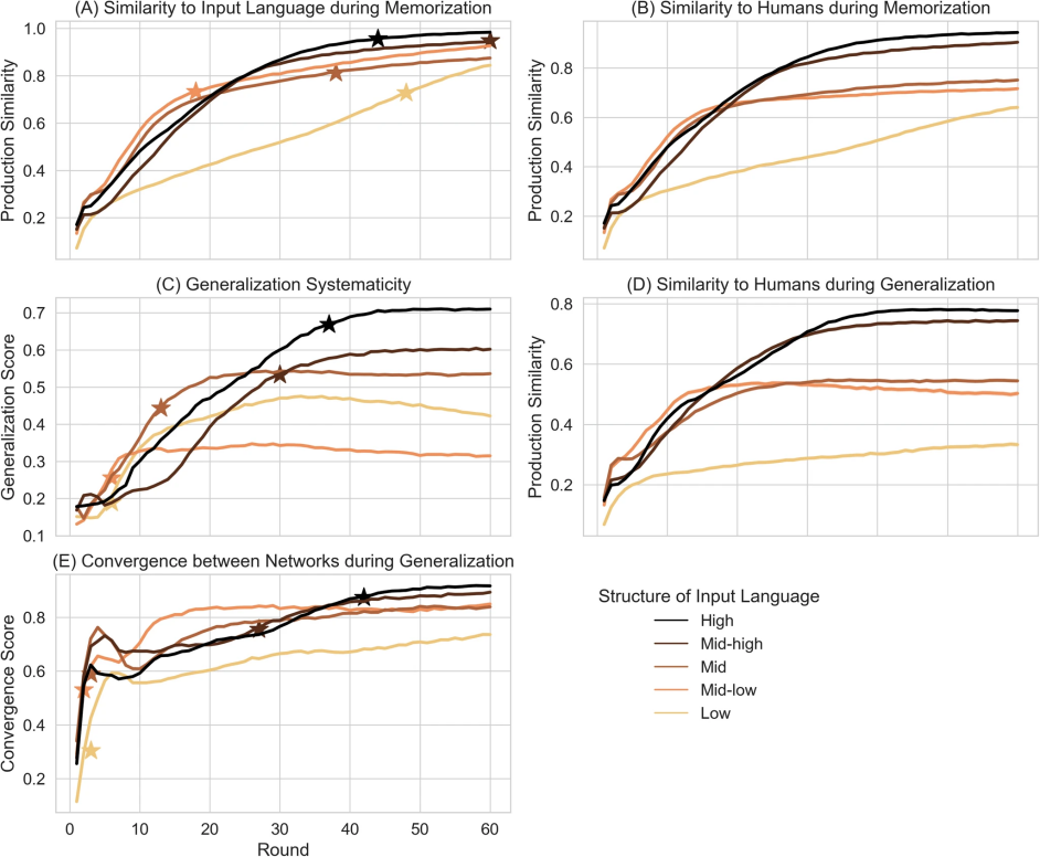在足够的训练轮次下,所有语言都可以被所有神经网络智能体学习,生成标签的生产相似性在第60轮时至少达到0.8(图5A)。结构化语言的学习效果显著更好,即这些语言与输入语言的相似性更高。然而,这种优势会随着训练轮次的增加而逐渐减弱。