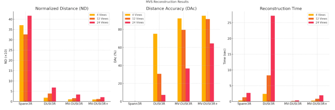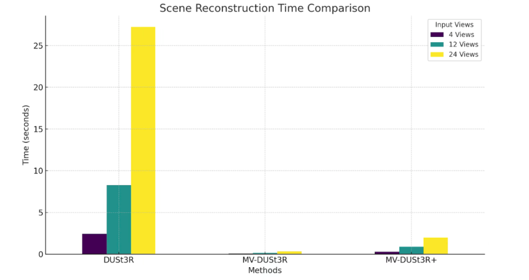 MV-DUSt3R+ 在不到 2 秒内即可完成大场景重建,展现出卓越的效率与实用性。
