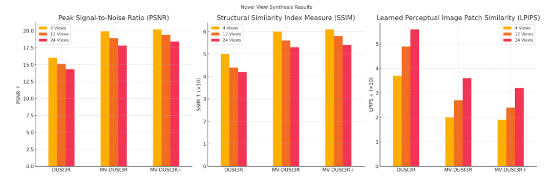 这种机制的优势在于,即使某些输入视图与单一参考视图之间的立体信息较弱,也可以从其他参考视图中获取补充信息,从而提高整体重建精度。在实验中,MV-DUSt3R+ 展现了出色的鲁棒性:在多房间和稀疏视角设置下,重建结果的误差显著降低,同时在新视角合成任务中生成的图像也更为精确,真实感更强。