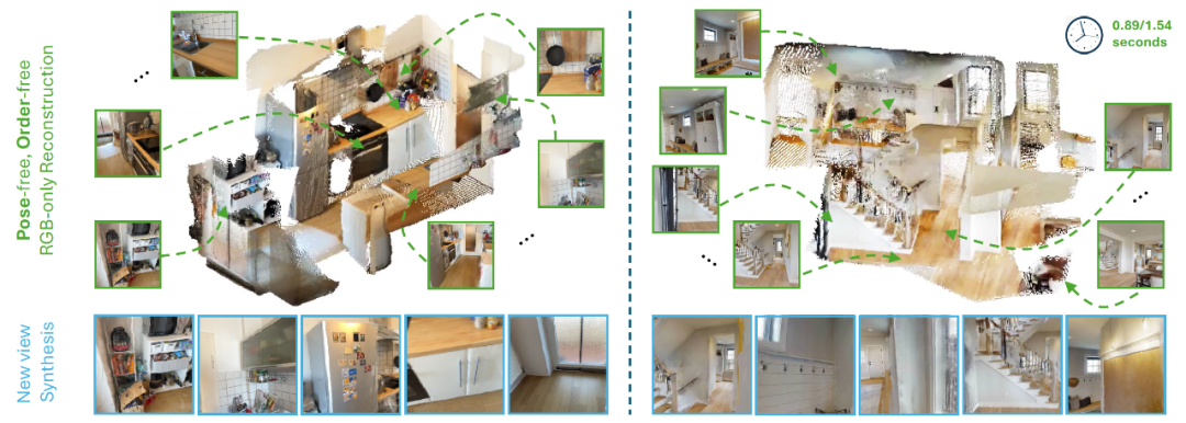 无需相机校准和姿态估计,处理任意数量的视图。在多视角重建任务中,传统方法通常依赖于相机内参和外参的精确估计,这需要额外的相机校准步骤,增加了系统复杂性和误差风险。