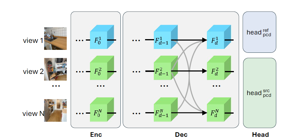 MV-DUSt3R+ 通过引入多视图解码器块,彻底摆脱了对相机参数的依赖,能够直接处理任意数量的视角输入。具体来说,多视图解码器块在网络中充当信息融合的关键角色,通过注意力机制在参考视图和所有其他视图之间进行高效信息交换。
