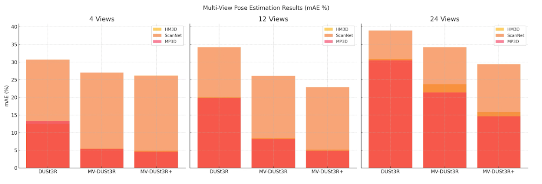 MV-DUSt3R 和 MV-DUSt3R+ 在相机位姿估计中显著优于基线。