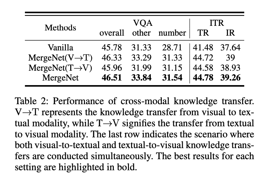 如表 2 所示,MergeNet 在不同设置下均显著提升了准确率。表明在模态信息进入模态交互器之前进行模态编码器之间的知识转移,有助于交互器更轻松地整合来自不同模态的信息。