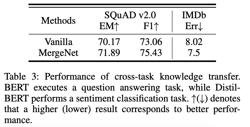 如表 3 所示,MergeNet 在两个任务上均实现了性能提升。例如,从分类任务向问答任务转移知识,使 Exact Match(EM)得分提高了 1.72%,F1 得分提高了 2.37%;从问答任务向分类任务转移知识,使错误率降低了 0.52%。