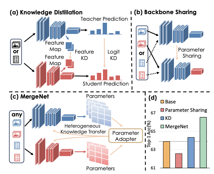 图 1. 知识蒸馏、骨干共享和 MergeNet 的比较