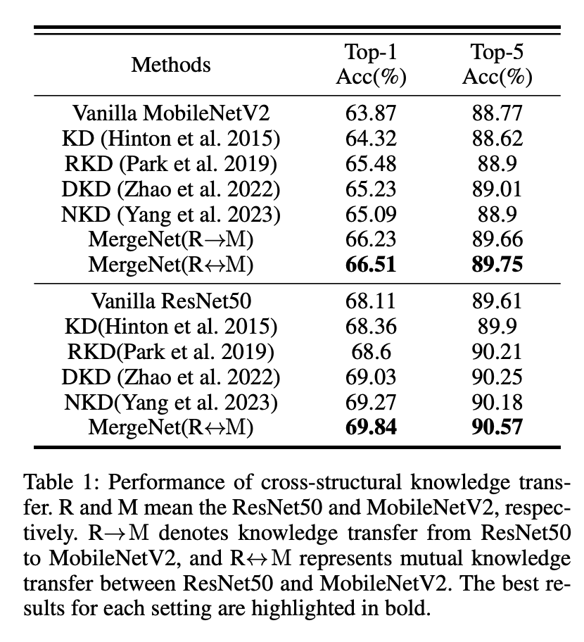 如表 1 所示,相比于知识蒸馏,MergeNet 在 MobileNetV2 上实现了 1.02% 的 Top-1 准确率提升。