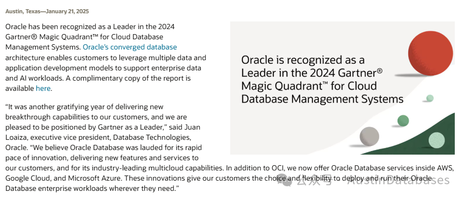 甲骨文被公认为 2024 年Gartner云数据库管理系统 ® 魔力象限™的领导者。甲骨文的融合数据库架构使客户能够利用多种数据和应用程序开发模型来支持企业数据和人工智能工作负载。此处提供了该报告的免费副本。 2025年甲骨文将再接再厉,转型成为云数据库业界的明星。