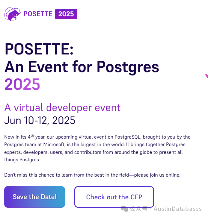 现在,由微软的 Postgres 团队为您带来的关于 PostgreSQL 的即将举行的虚拟活动已进入第 4 个年头,它是世界上规模最大的活动。它将来自全球的 Postgres 专家、开发人员、用户和贡献者聚集在一起,展示与 Postgres 相关的一切。 POSETTE 代表着PostgreSQL开源生态系统讲座、培训和教育。加入我们,参加4场独特的直播,向开源用户、Azure数据库客户以及PostgreSQL专家学习。所有讲座将在活动结束后在线提供。