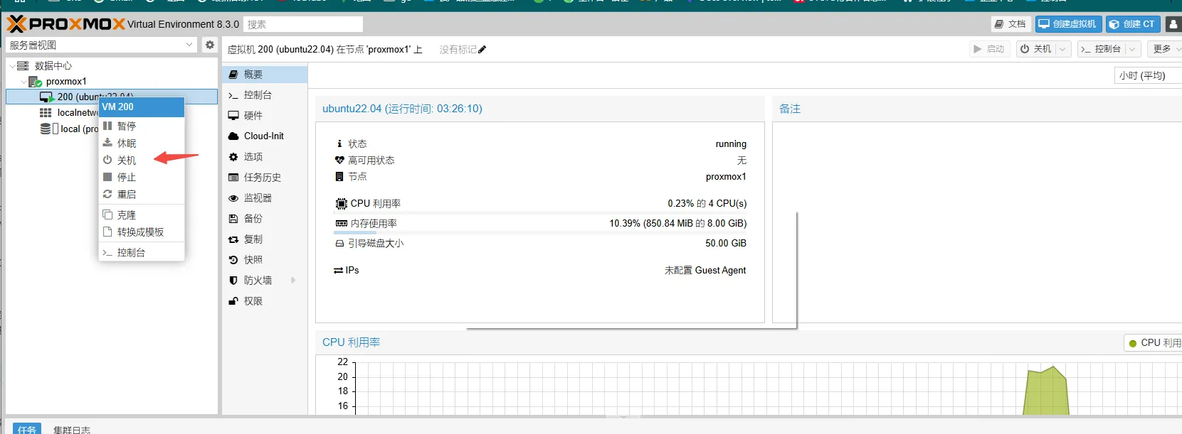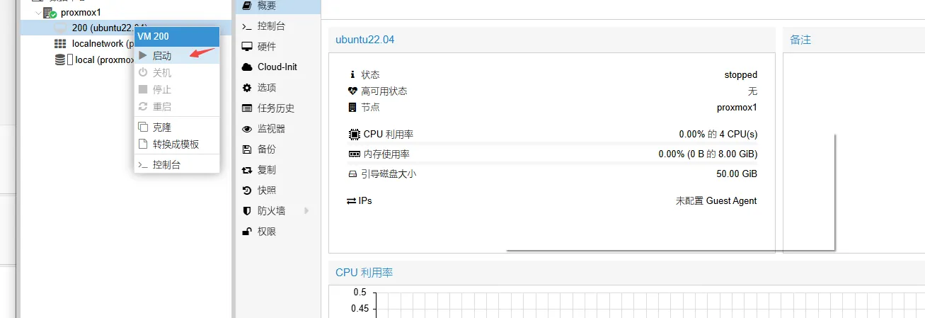 通过proxmoxweb控制台右击对应VM ID(200)启动对应虚拟机(如果上一步可以勾选创建后启动,可以省略这一步)