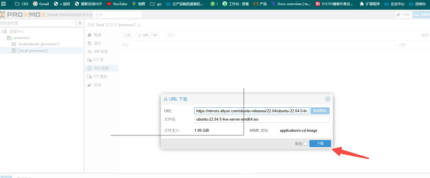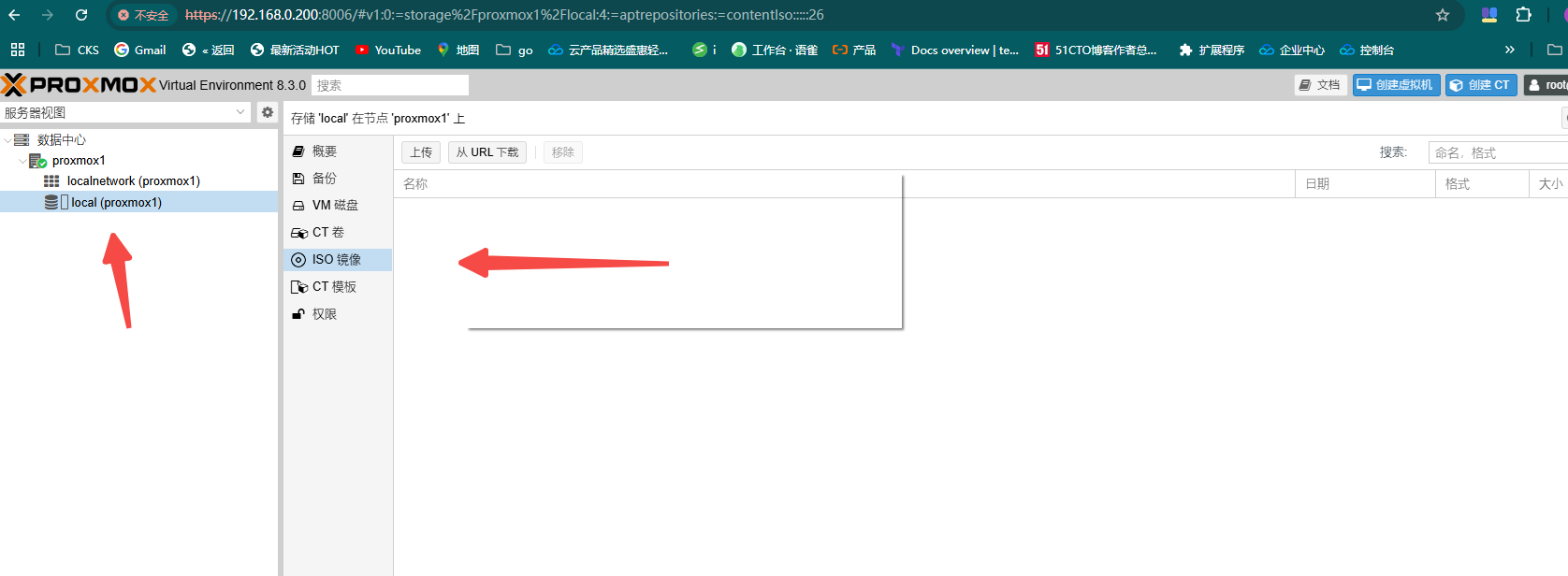登录proxmox浏览器控制台,点击proxmox1主机下:local-iso镜像,可以通过上传or从url下载,将要安装的iso镜像上传或者下载到proxmox存储下: