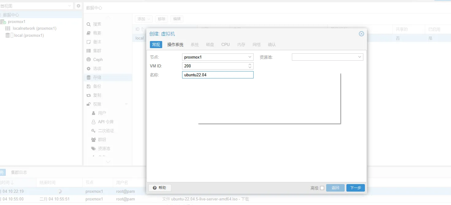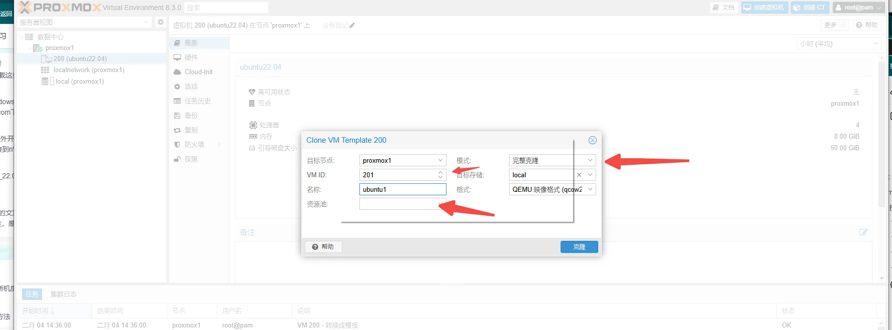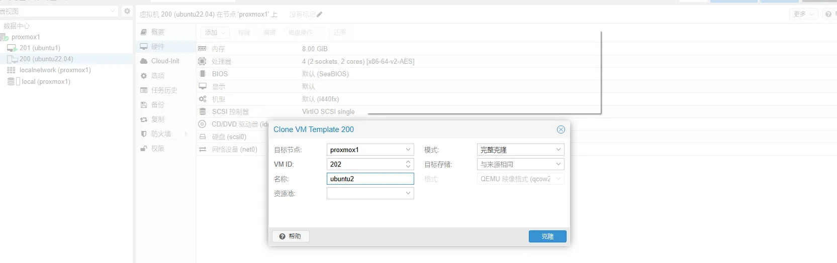 proxmox控制台右击id为200的虚拟机模版-克隆