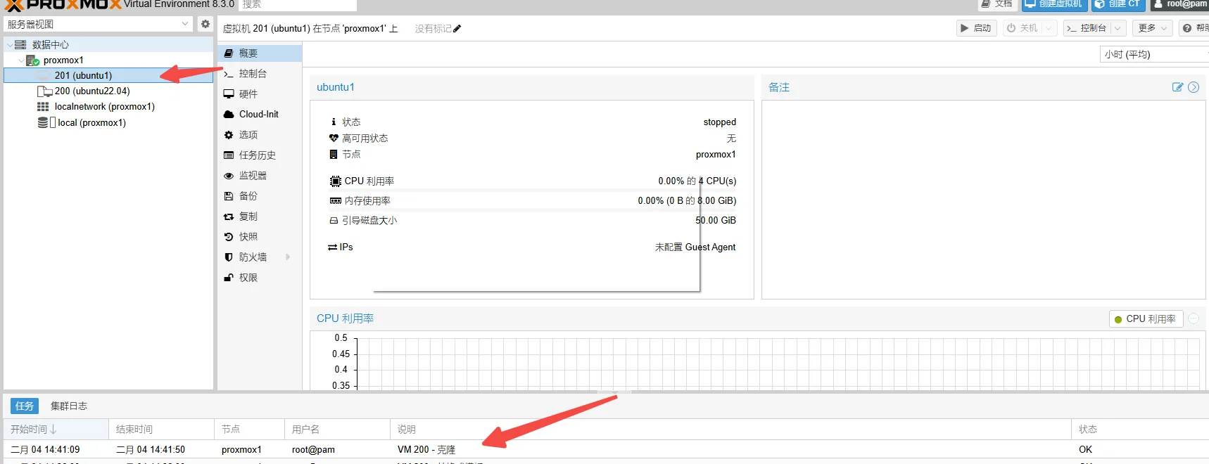 是否需要做额外配置,让ip自动获取呢?尝试一下创建一个新的VM ID 202的ubuntu虚拟机: