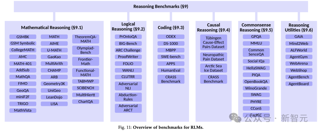 现在概述与RLM(推理语言模型)相关的基准测试。针对不同类型的推理,包括数学推理、逻辑推理、因果推理和常识推理,列出每个类别的代表性基准测试。