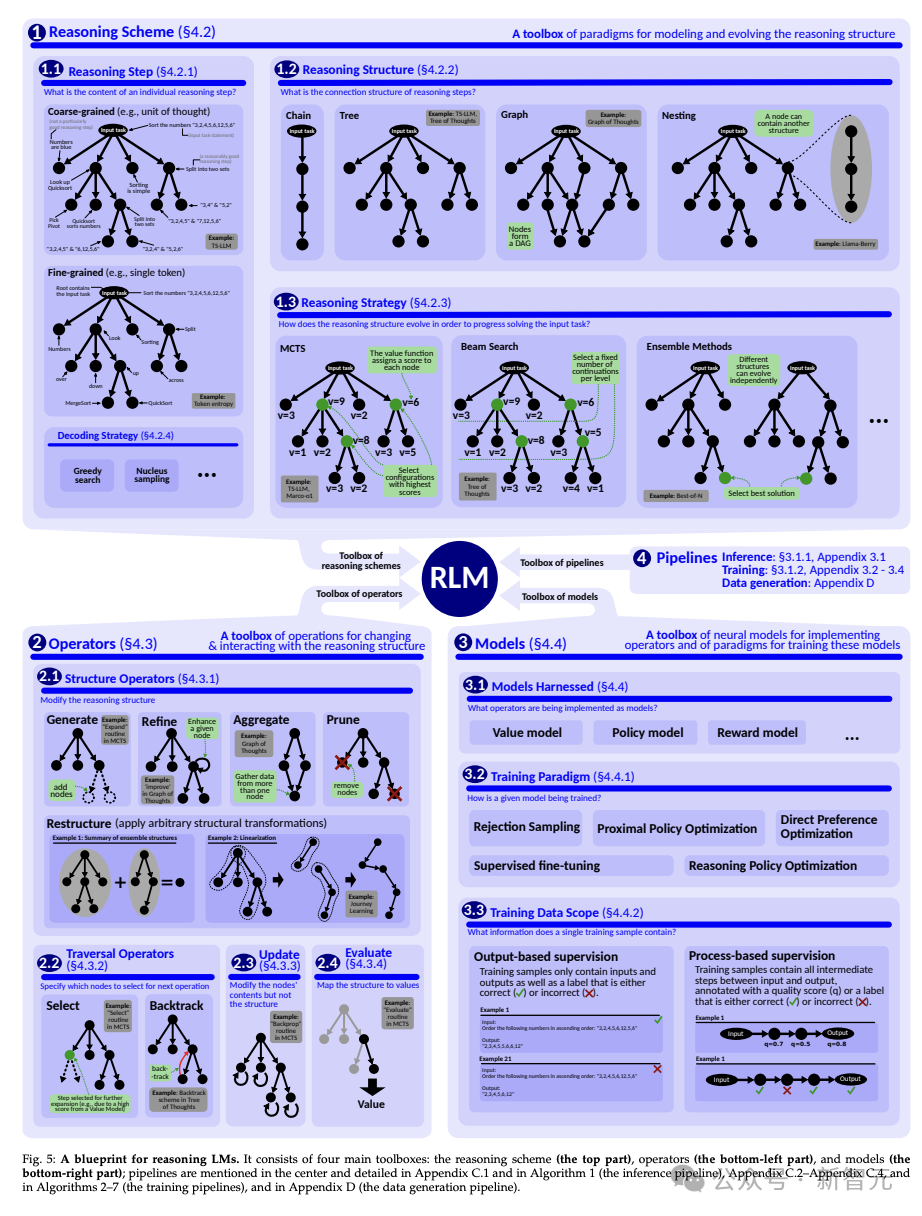 针对这一问题,近日联邦理工联合其他机构的研究人员,在arxiv发表了论文,基于对RLM研究工作的调查和分析,提出了全面的蓝图,将RLM组件组织为模块化框架,包含了不同的推理结构、推理策略和监督方案。
