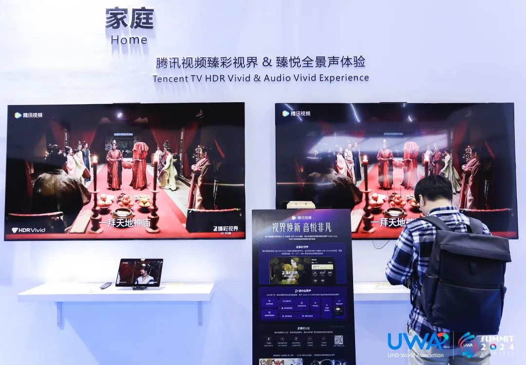 此外,大会还同期举办超高清产业生态体验展,展示超高清产业的发展进程及创新成果。此次体验展上,腾讯视频展区集合臻彩视界、臻悦全景声两大视听品牌,通过电视、手机、平板等终端展示高达4k 60帧的HDR Vivid画质和Audio Vivid菁彩声,为现场观众带来了沉浸非凡的视听体验。