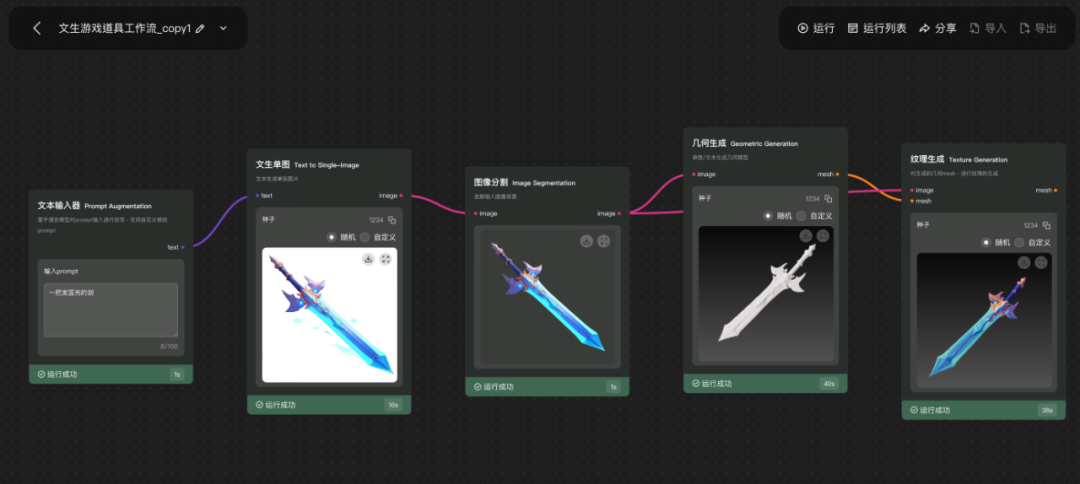 混元3D AI创作引擎还支持设计3D生成工作流,用户只需要输入提示词,或上传图片,调整节点生成参数,即可一键生成具有特定风格和特征的3D资产,进一步降低专业用户使用门槛,大幅改进3D创作管线效率。