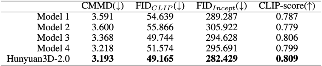 根据 CLIP Maximum Mean Discrepancy (CMMD)、Frechet Inception Distance (FID) 和 CLIP-score 指标,Hunyuan3D-2.0模型的整体表现,在业界处于领先梯队。