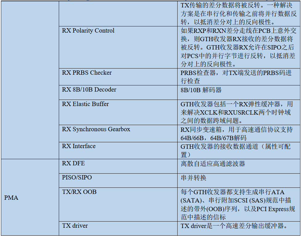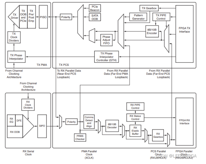 GTXE2_CHANNEL 的发送端和接收端功能是独立的,均由 PMA(Physical Media Attachment,物理媒介适配层)和 PCS(Physical Coding Sublayer,物理编码子层)两个子层组成。其中 PMA 子层包含高速串并转换(Serdes)、预/后加重、接收均衡、时钟发生器及时钟恢复等电路。PCS 子层包含8B/10B 编解码、缓冲区、通道绑定和时钟修正等电路。