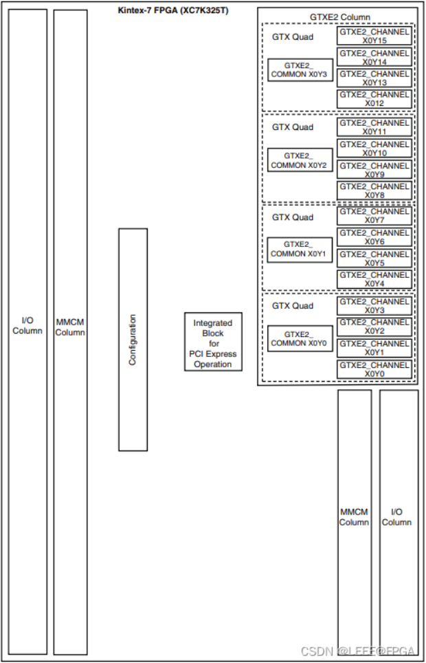 如下图所示,Xilinx以Quad来对串行高速收发器进行分组,四个串行高速收发器(GTXE2_CHANNEL)和一个 GTXE2_COMMOM组成一个 Quad,每一个串行高速收发器称为一个 Channel(通道)。