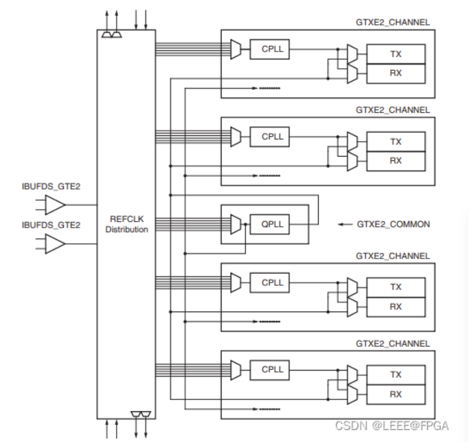 一个QUAD的内部结构如下图所示,由四个GTXE2_CHANNEL 原语和一个GTXE2_COMMON原语组成。