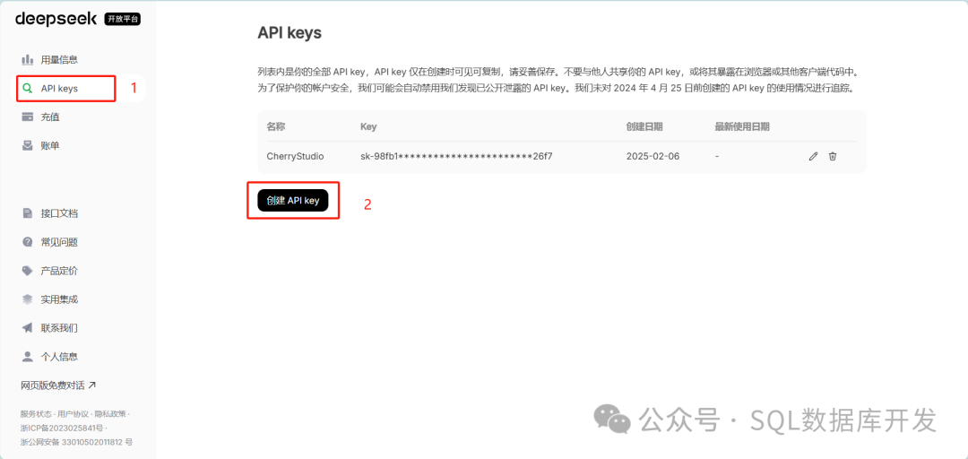 在页面左侧菜单的“API Key”,然后点击“创建API Key”