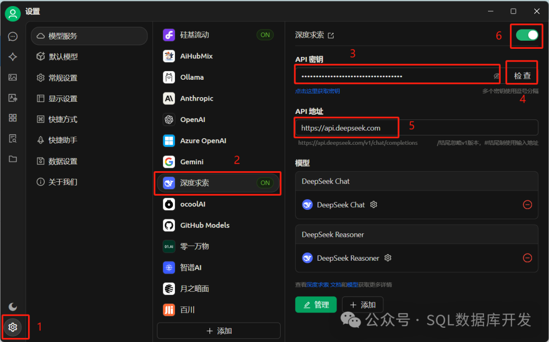 或者直接看下图,按顺序操作即可,务必记得开启右上角的按钮,保证DeepSeek是“ON”状态。