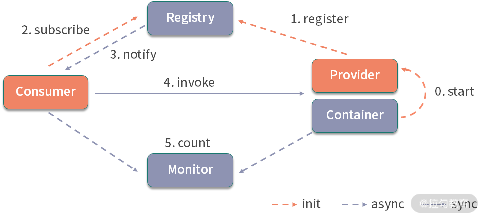 Registry:注册中心。 负责服务地址的注册与查找,服务的 Provider 和 Consumer 只在启动时与注册中心交互。注册中心通过长连接感知 Provider 的存在,在 Provider 出现宕机的时候,注册中心会立即推送相关事件通知 Consumer。