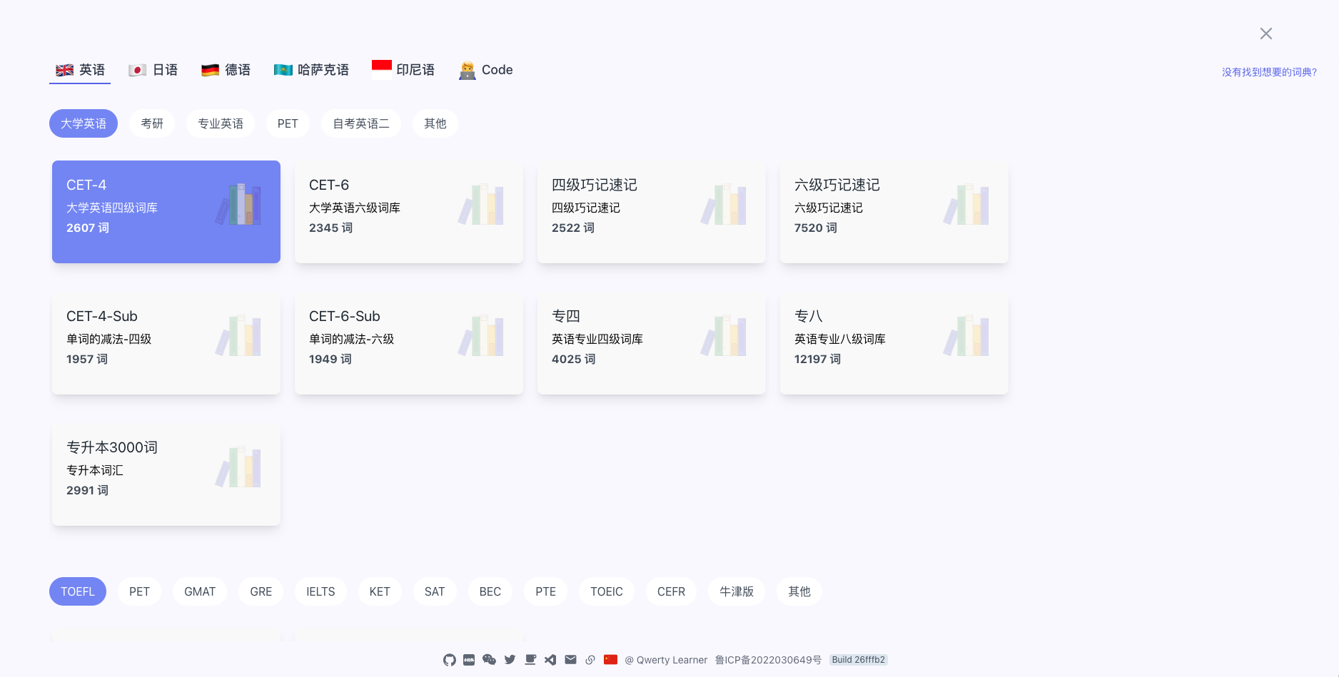 Qwerty Learner 内置了多种常用的英语词库,包括但不限于: