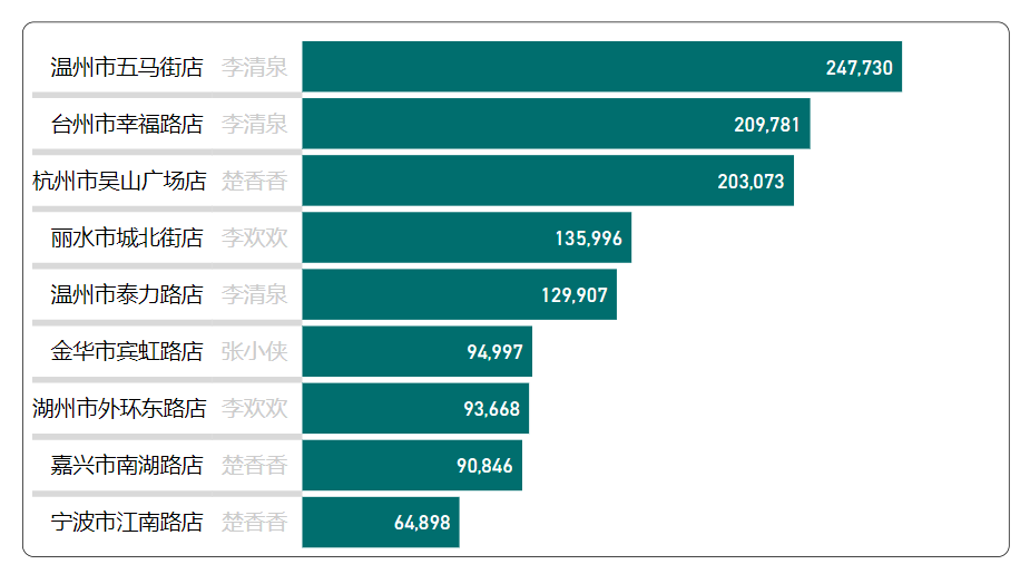 Power BI内置条形图通过一点小技巧可以添加辅助信息,比如下图添加了门店负责人,并淡灰色显示。