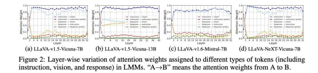 为了在减少视觉token的同时保持视觉理解能力,研究者首先分析了 LMMs如何处理和理解大量视觉token。分析集中在LLaVA架构,特别从注意力机制的角度探讨了视觉token的作用及其数量对LMMs性能的影响。具体而言,实验评估了视觉token在LMMs不同层中的重要性,涵盖了多种 LMMs,以识别不同规模和训练数据集的模型之间的共性。