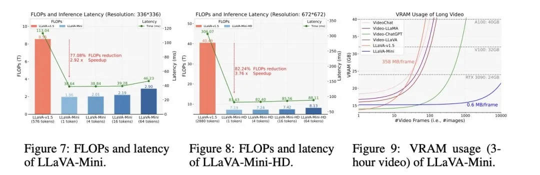 在性能与LLaVA-v1.5相当的情况下,我们进一步探讨了LLaVA-Mini的计算效率。图7、图8和图9展示了LLaVA-Mini在计算负载、推理延迟和内存使用方面的优势,其中FLOPs由calflops计算,延迟则在不使用任何工程加速技术的A100上进行测试。