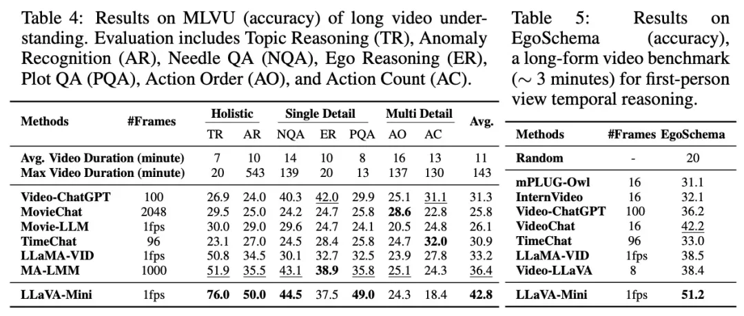 LLaVA-Mini在长视频理解上具有显著优势。通过将每帧表示为一个视觉 token,LLaVA-Mini在推理时能够轻松扩展到更长的视频,并且通过token之间的位置编码隐式建模时序关系。特别地,LLaVA-Mini仅在少于1 分钟(<60帧)的视频上进行训练,且在推理时能够处理超过2小时(> 7200帧)的长视频。
