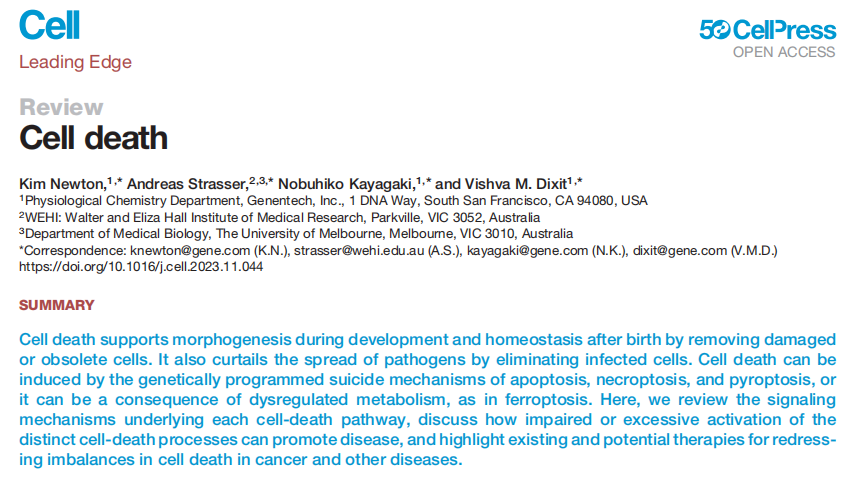 2024年1月18日,美国Genentech公司生理化学系的Kim Newton等人在CELL发表了题为《Cell death》的综述,该综述描述了各种细胞死亡路径的信号机制,探讨这些细胞死亡过程的异常激活或抑制如何导致疾病,并讨论了针对细胞死亡失衡状态的现有和潜在治疗方法。