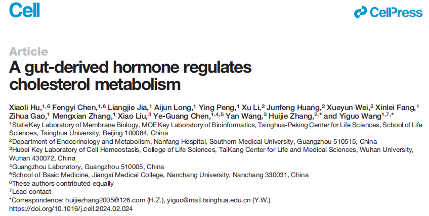 2024年3月18日,清华大学生命科学学院王一国团队与南方医科大学南方医院张惠杰团队在Cell发表了题为《A gut-derived hormone regulates cholesterol metabolism》的研究论文,首次发现并命名一种肠道激素Cholesin(肠抑脂素),揭示 Cholesin 调控机体胆固醇稳态的作用和机制,为治疗高胆固醇血症和动脉粥样硬化、心血管疾病、退行性疾病和癌症等提供科学依据和潜在的治疗策略和通用药物干预靶点。
