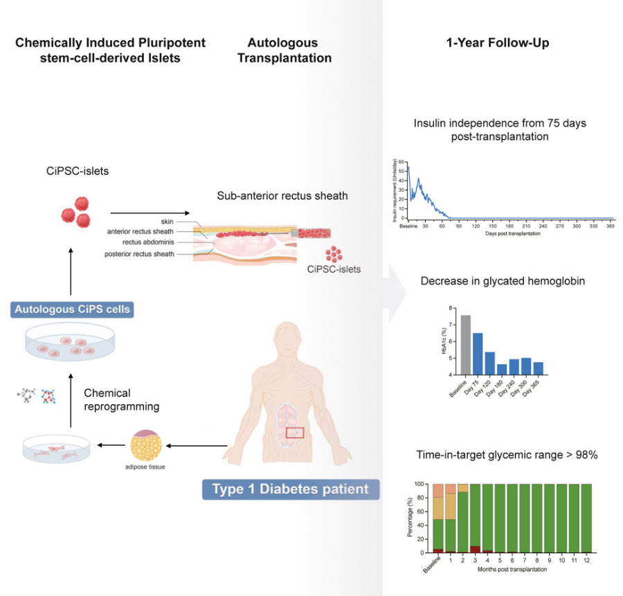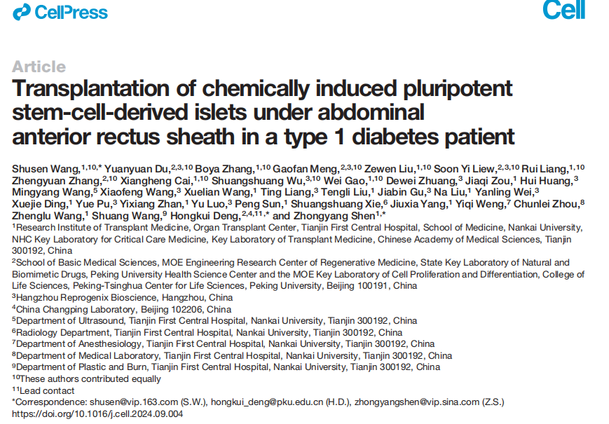 2024年9月24日,南开大学/天津市第一中心医院沈中阳、王树森、北京大学/昌平实验室邓宏魁等合作在Cell发表题为 《Transplantation of Chemically Induced Pluripotent Stem-Cell-Derived Islet Under Abdominal Anterior Rectus Sheath in a Type 1 Diabetes Patient》的研究论文,该研究报告了一项1型糖尿病患者腹前直肌鞘下化学诱导多能干细胞来源胰岛移植的人体I期临床试验的初步分析结果。