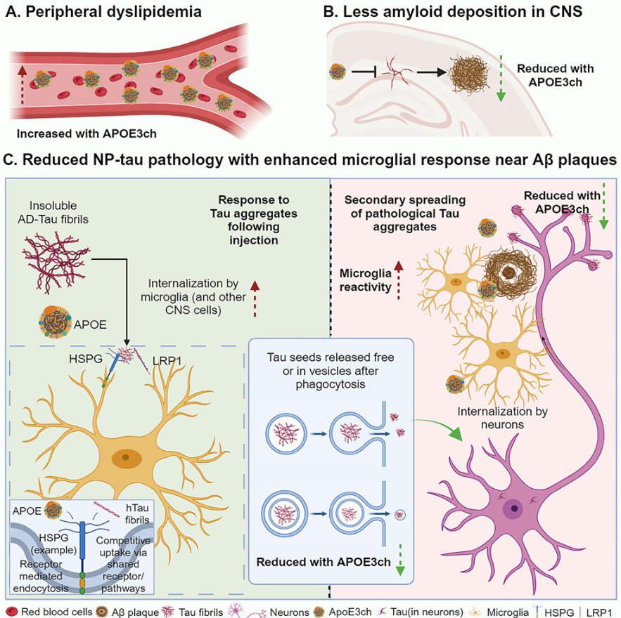2024年1月18日,美国华盛顿大学医学院的David M. Holtzman团队在Cell上发表了一篇题为《APOE3ch alters microglial response and suppresses Ab-induced tau seeding and spread》的研究论文,揭示了 APOE3ch 对 AD 发挥保护作用的潜在分子机制,首次揭示了一类阻断AD病征从Aβ过渡到tau阶段的潜在靶点。