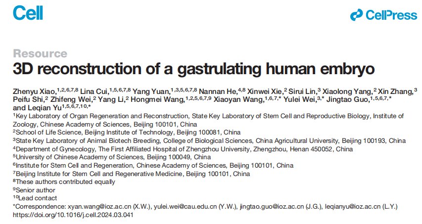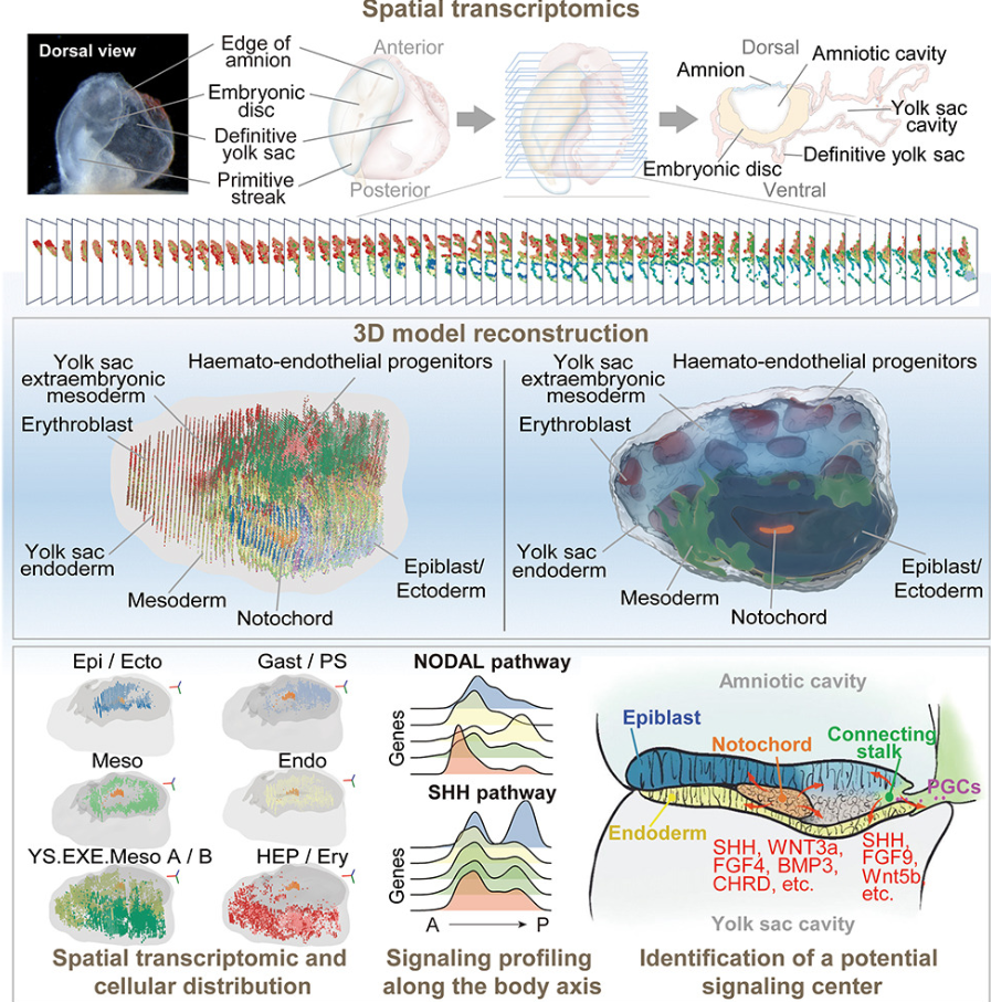 2024年4月23日,中国科学院动物研究所和北京干细胞与再生医学研究院的于乐谦、郭靖涛、中国农业大学魏育蕾等在Cell上发表了题为《3D Reconstruction of a Gastrulating Human Embryo》的研究论文。该研究基于一枚珍贵的CS8时期完整人类胚胎,利用连续横断面(transverse plane)高分辨空间转录组切片,结合机器学习算法进行三维对齐,构建了完整胚胎中不同细胞类型与基因表达的三维空间分布点云图,进而重构了首个数字3D的完整人类原肠胚模型。