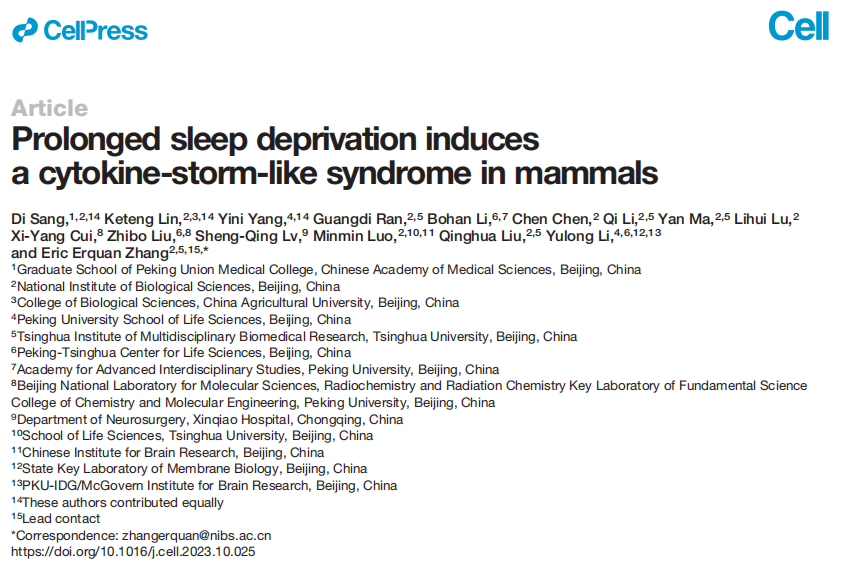 2023年12月27日,北京生命科学研究所张二荃团队在Cell上发表了题为《Prolonged sleep deprivation induces a cytokine-storm-like syndrome in mammals》 的研究论文,探讨了长期睡眠剥夺如何在哺乳动物中引发类似细胞因子风暴的全身炎症反应。
