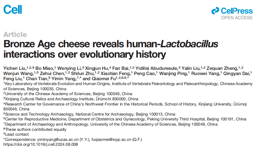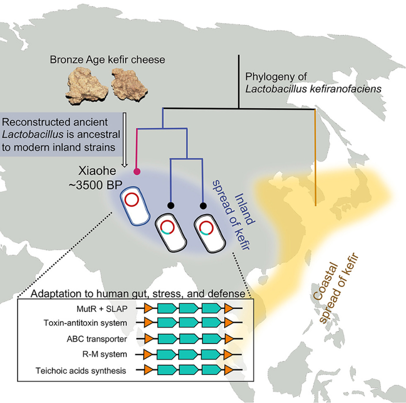 2024年9月25日,中国科学院古脊椎动物与古人类研究所付巧妹、中国科学院大学杨益民团队在Cell 发表题为《Bronze Age cheese reveals human-Lactobacillus interactions over evolutionary history》的研究论文,该研究通过从小河墓地提取青铜时代开菲尔(kefir)奶酪(约3500年前)的古代DNA,探索了过去人类与微生物的相互作用。