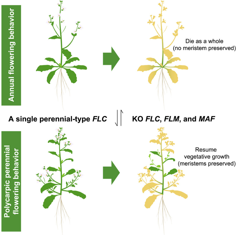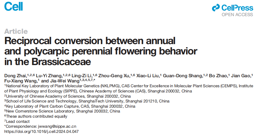 2024年5月28日,中国科学院分子植物科学卓越创新中心王佳伟团队在Cell发表了题为《Reciprocal conversion between annual and polycarpic perennial flowering behavior in the Brassicaceae》的研究论文,揭示了决定植物多年生和一年生生活史策略的关键基因:MADS-box genes。