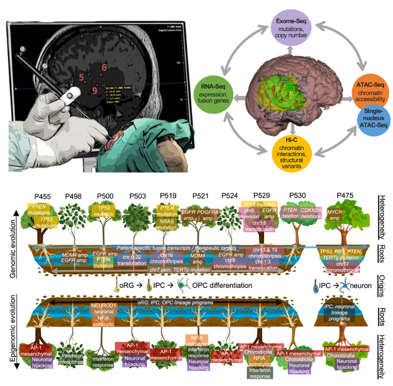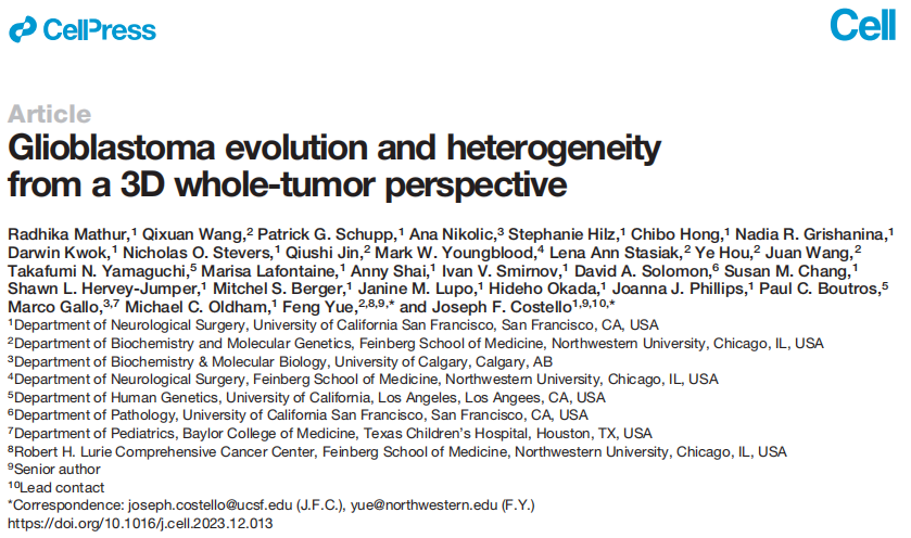 2024年1月18日,美国西北大学Feinberg医学院岳峰教授团队、加利福尼亚大学旧金山分校Joseph Costello教授团队在Cell发表了题为《Glioblastoma evolution and heterogeneity from a 3D whole-tumor perspective》的研究论文,该研究首次从三维全肿瘤视角描绘了GBM的演化和异质性,通过3D神经导航技术,在为每位原发性IDT-WT GBM患者进行手术切除时收集了~10个不同位置的样本。