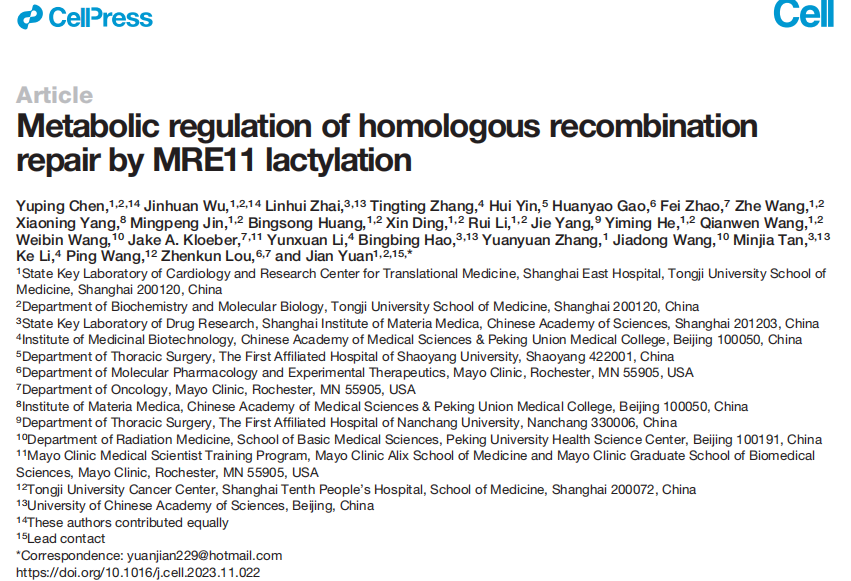 2024年01月18日,同济大学医学院/附属东方医院的袁健教授团队在CELL上发表题为《Metabolic regulation of homologous recombination repair by MRE11 lactylation》的研究文章,揭示了细胞代谢与同源重组修复之间的关键分子链接,为靶向DNA修复、克服肿瘤耐药提供了新的理论基础和潜在靶点。
