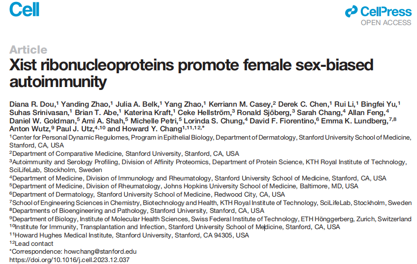 2024年2月1日,斯坦福大学 Howard Y. Chang(张元豪) 团队在 Cell 发表了题为《Xist ribonucleoproteins promote female sex-biased autoimmunity》 的研究论文,该研究揭示了 XIST RNP 对独立于性染色体或激素背景的自身免疫倾向的影响。