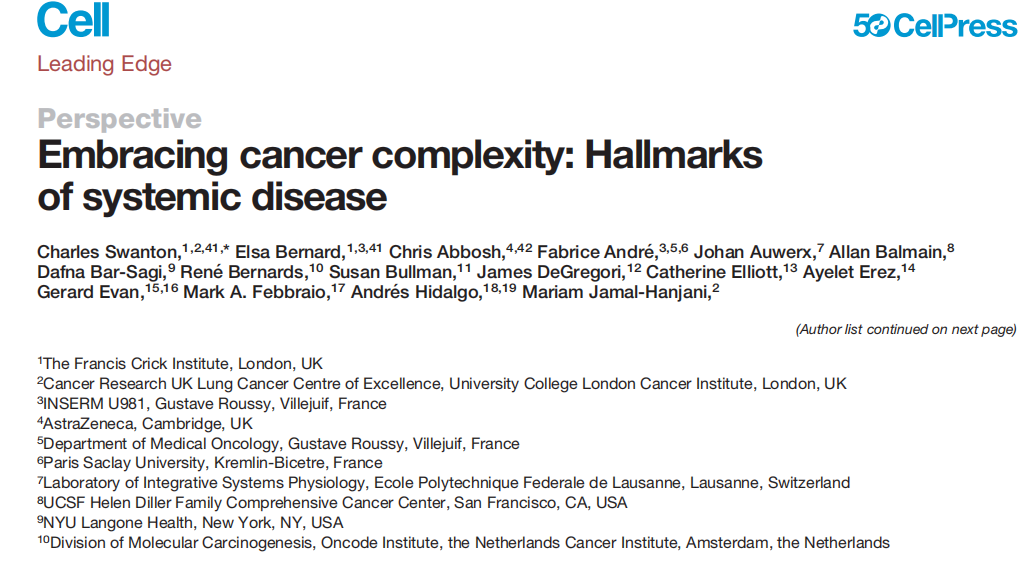 2024年3月28日,英国Francis Crick 研究所在Cell发表了题为《Embracing cancer complexity: Hallmarks of systemic disease》的研究论文,探讨了肿瘤作为系统性疾病的复杂性,包括肿瘤启动和促进、微环境、免疫、衰老、代谢、肥胖、恶病质、昼夜节律、神经系统、血栓形成和微生物组等方面。