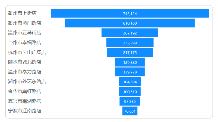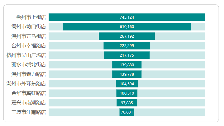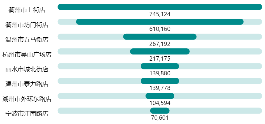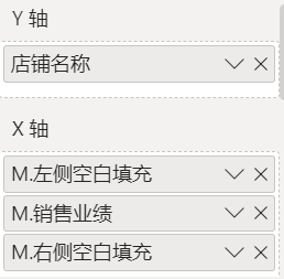 ( MAXX ( ALLSELECTED ( '店铺资料'[店铺名称] ), [M.销售业绩] ) - [M.销售业绩] ) / 2堆积条形图如下拖拽字段:
