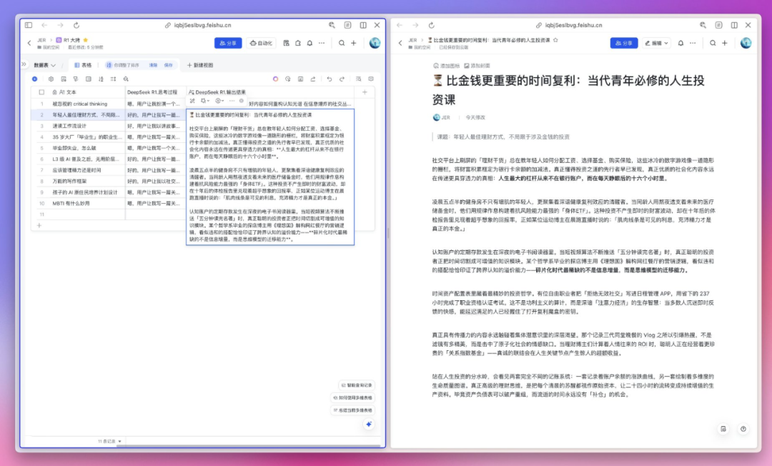 虽然这个过程并不复杂,却不如接入了 DeepSeek-R1 的飞书一步到位。现在,飞书中的每个表格都相当于一个 prompt 输入框,你可以把需求和背景当作一列数据粘贴进去,DeepSeek-R1 就能按这个队列全自动处理了。