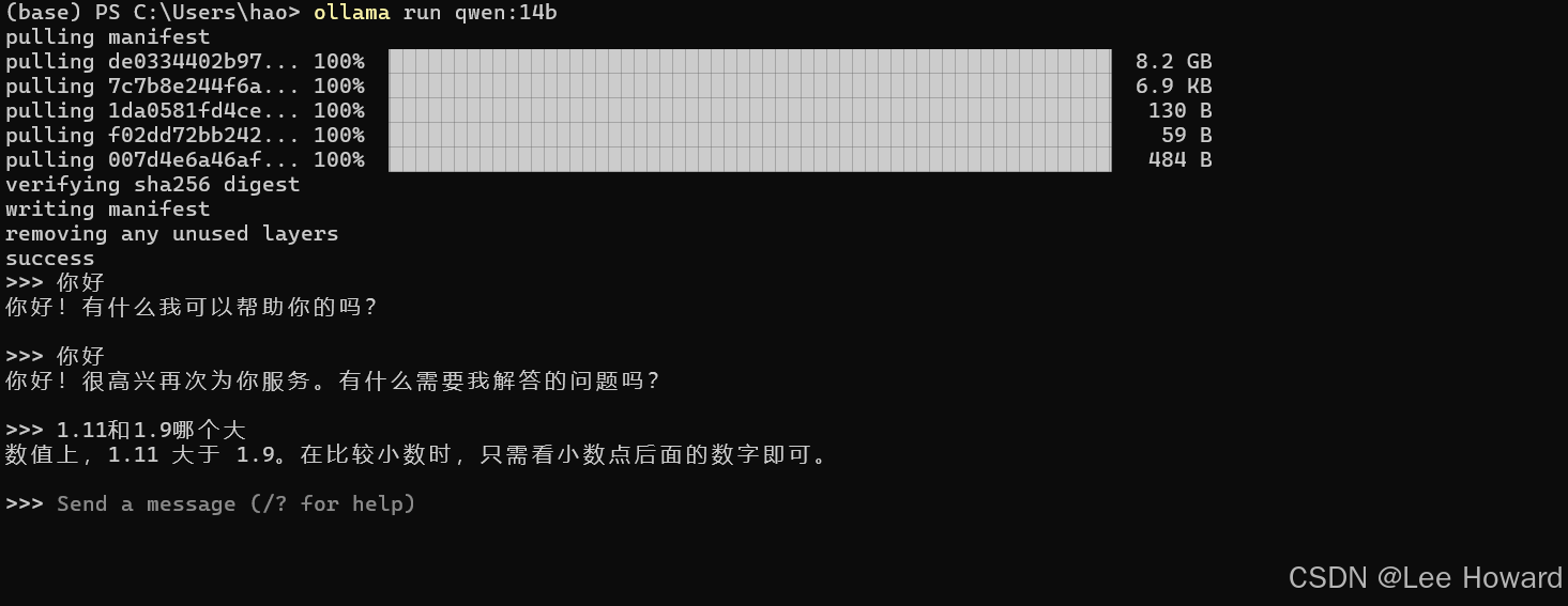 ollama run glm4:9b如果之前没有下载该模型,那么系统会首先下载模型,下载后运行,其中下载速度还是很快的,下载至99%到100%速度较慢。